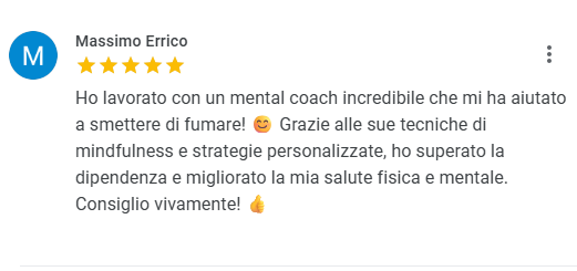 Ho lavorato con un mental coach incredibile che mi ha aiutato a smettere di fumare! 😊 Grazie alle sue tecniche di mindfulness e strategie personalizzate, ho superato la dipendenza e migliorato la mia salute fisica e mentale. Consiglio vivamente! 👍